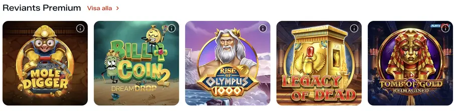 Hela spelbiblioteket på Reviant Casino känns kurerat och modernt. Istället för att bara ösa in tusentals spel har de valt ut titlar som faktiskt håller hög kvalitet. Jag hittade allt från NetEnt och Play’n GO till stora live-spel från Evolution.