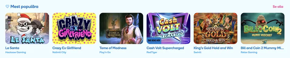 Vera & John har en mycket trevlig spelmiljö där man inspireras att spela på de spel som casinot erbjuder. Utbudet av casinospel är mycket stort och varierande och här finner man casinospel som levererats av speltillverkare som bland annat NetEnt och Yggdrasil, Microgaming, IGT, Play’n Go, Thunderkick, BetSoft Gaming, Bally, NYX, Leander Games, Evolution Gaming, William Interactive och Quickspin.